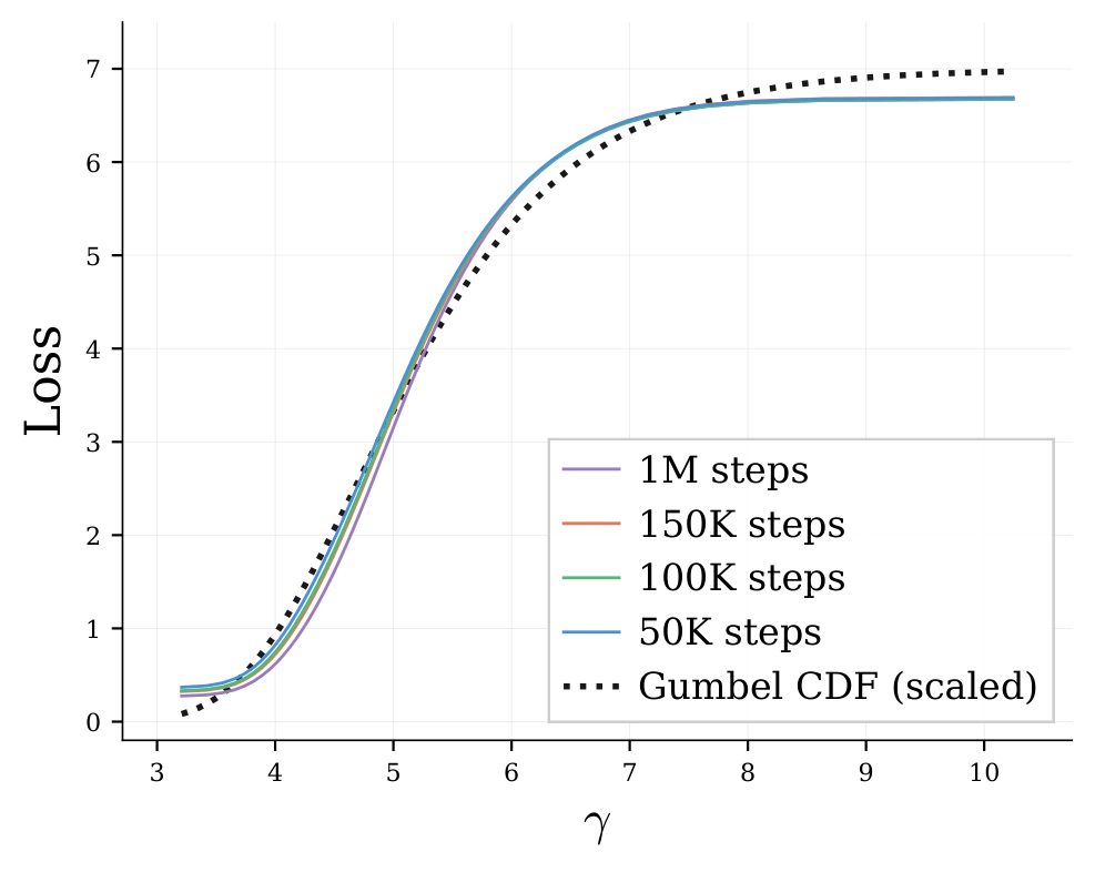 To apply our principle, we reuse the curve of loss-\(\gamma\) above (now we know it is exactly the curve of \(H_\gamma\)-\(\gamma\)). Comparing \(H'_\gamma\) from checkpoints at 50k, 100k, and 150k steps, we find that the derivative is strictly unimodal and positively skewed. Surprisingly, we discover that a Gumbel distribution provides an excellent match for the \(H_\gamma\)-\(\gamma\) distribution: