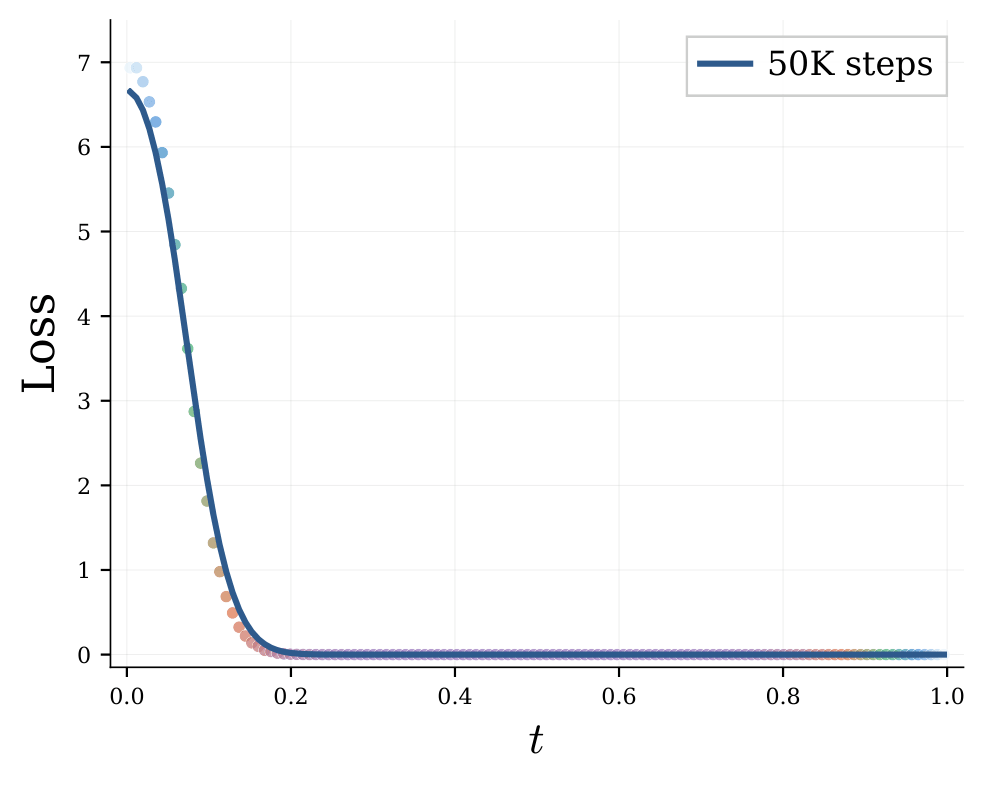 Plotting the per-noise-level CE loss \(\mathcal{L}_\gamma = \frac{1}{L}\sum_i \mathbb{E}[-\log q_\theta^{(i)}(x^{(i)} \mid \mathbf{z}_\gamma, \gamma)]\) over \(\gamma\) reveals something striking: the loss curve is remarkably stable across training stages (from 50k to 1M steps). This is not coincidence: By the standard information-theoretic decomposition,