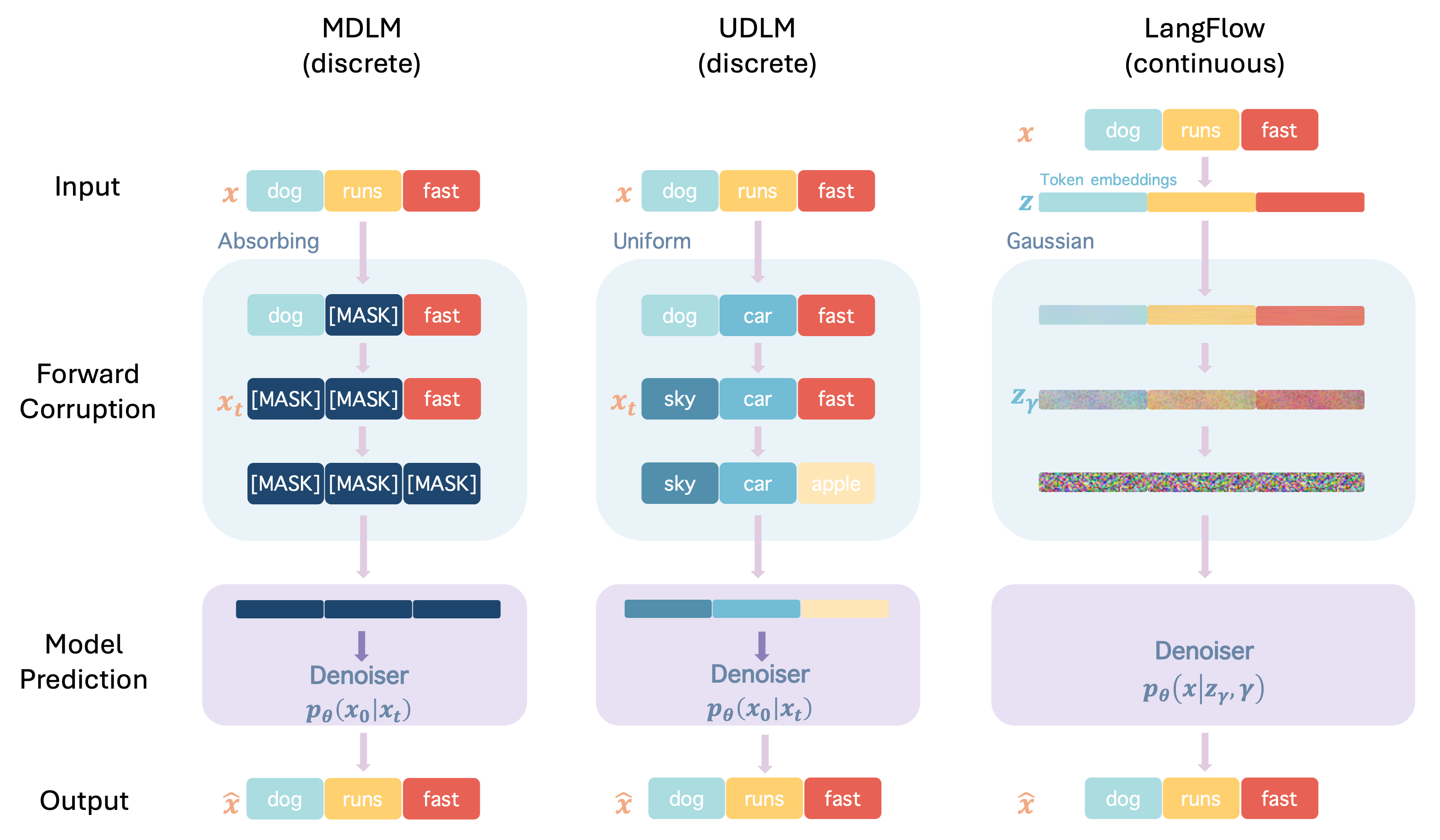 We begin by reframing embedding-space diffusion, a classical framework of continuous diffusion language models. Let \(\mathcal{E} \in \mathbb{R}^{V \times D}\) be an embedding matrix over a vocabulary of size \(V\), mapping each text token \(x^{(i)}\) to a \(D\)-dimensional vector \(\mathbf{e}_{x^{(i)}}\). A sequence of tokens \(\mathbf{x} = (x^{(1)}, \ldots, x^{(L)})\) is thus embedded into a continuous matrix \(\mathbf{z} = (\mathbf{e}_{x^{(1)}}, \ldots, \mathbf{e}_{x^{(L)}}) \in \mathbb{R}^{L \times D}\), and we define the generative target of the flow as this embedding \(\mathbf{z}\).