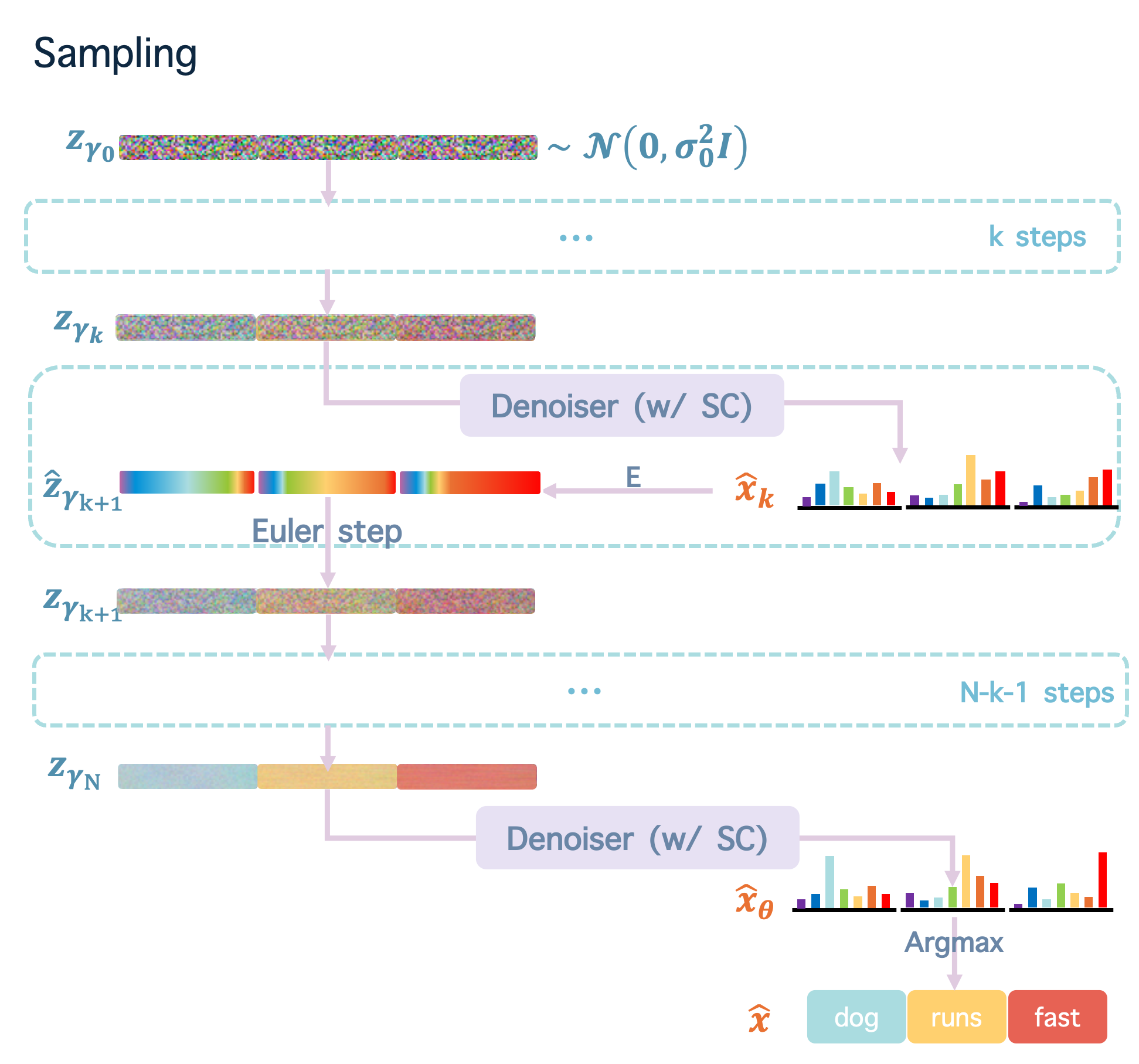 Sampling With a trained velocity function $\mathbf{v}_\theta(\mathbf{z}_t, t)$, we sample text examples by a two-stage process: First, we generate clean text embedding $z_{\gamma_N}$ by progressively denoising a sampled Gaussian prior $z_{\gamma_0}$ as standard Flow Matching; Second, we apply the discrete token predictor $\hat{\mathbf{x}}_\theta(\mathbf{z}_t, t)$ (Denoiser in the figure, which is part of $\mathbf{v}_\theta(\mathbf{z}_t, t)$ as described in Training) to the clean text embedding $z_{\gamma_N}$ to obtain the final probability distribution $\hat{x}_\theta$ and sample the token $\hat{x}$ from this distribution via Argmax.
