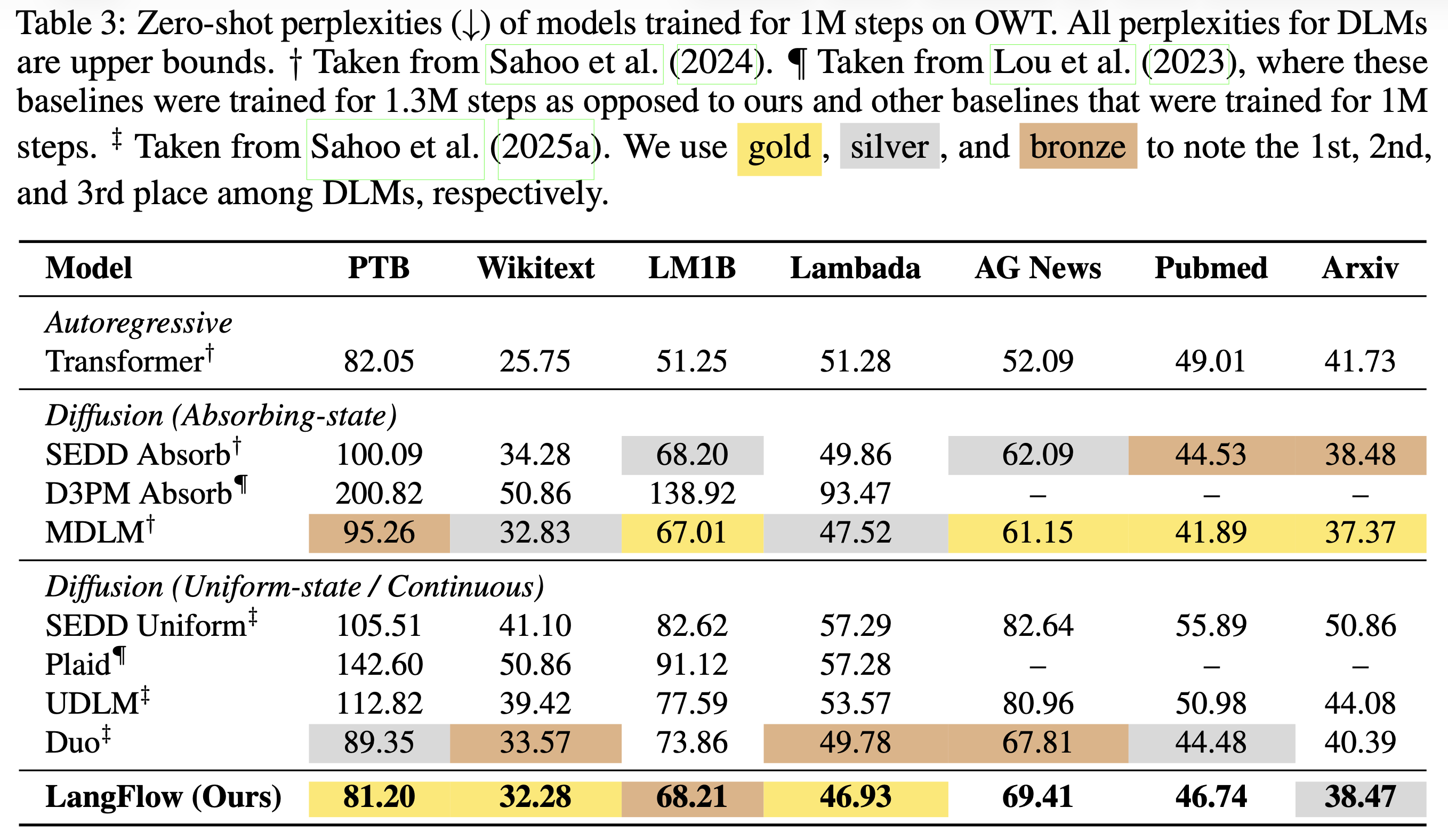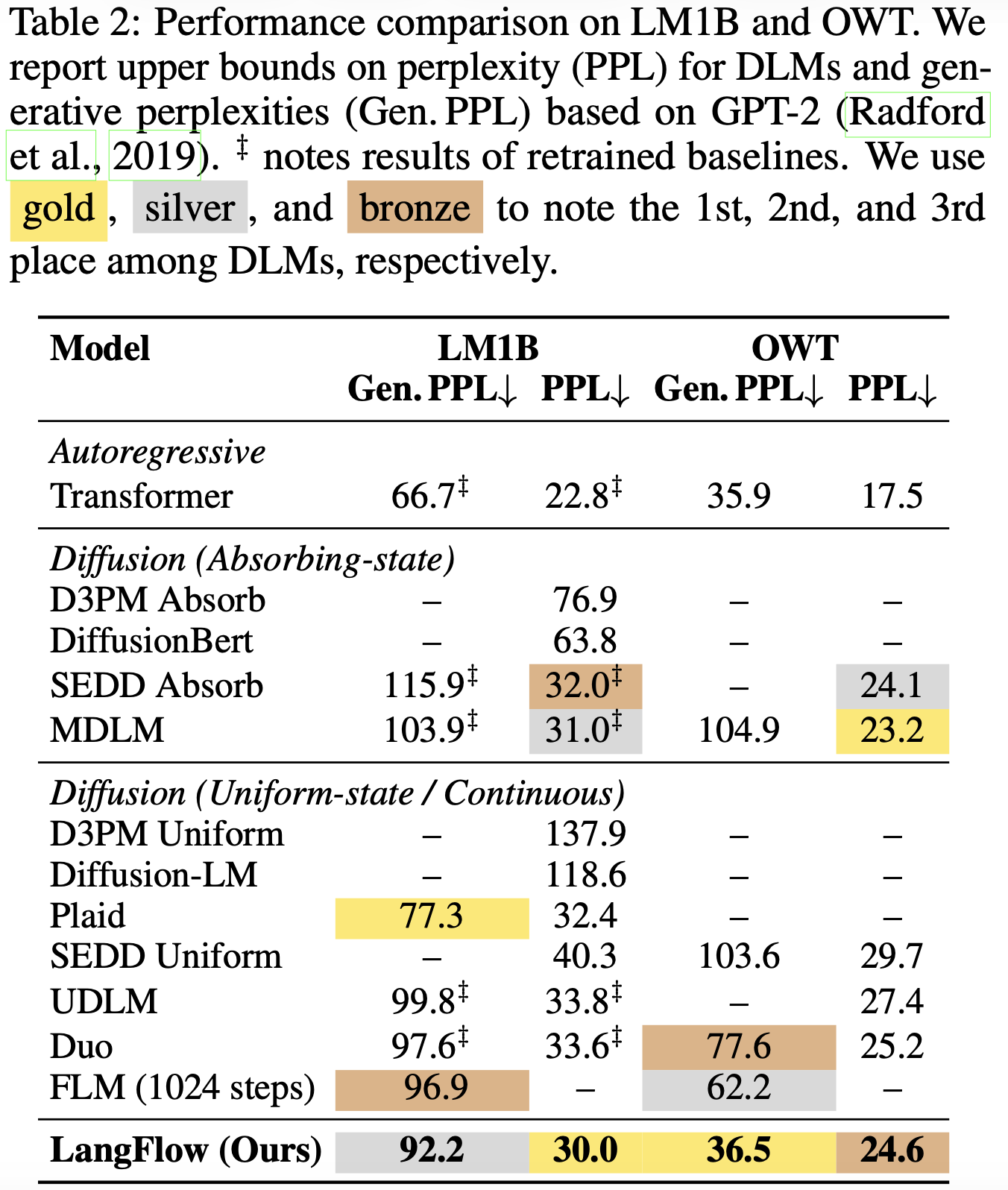 In language modeling, we train models on the training split of LM1B and OWT and report their perplexity (PPL) and generative perplexity (Gen. PPL) on the corresponding validation split;